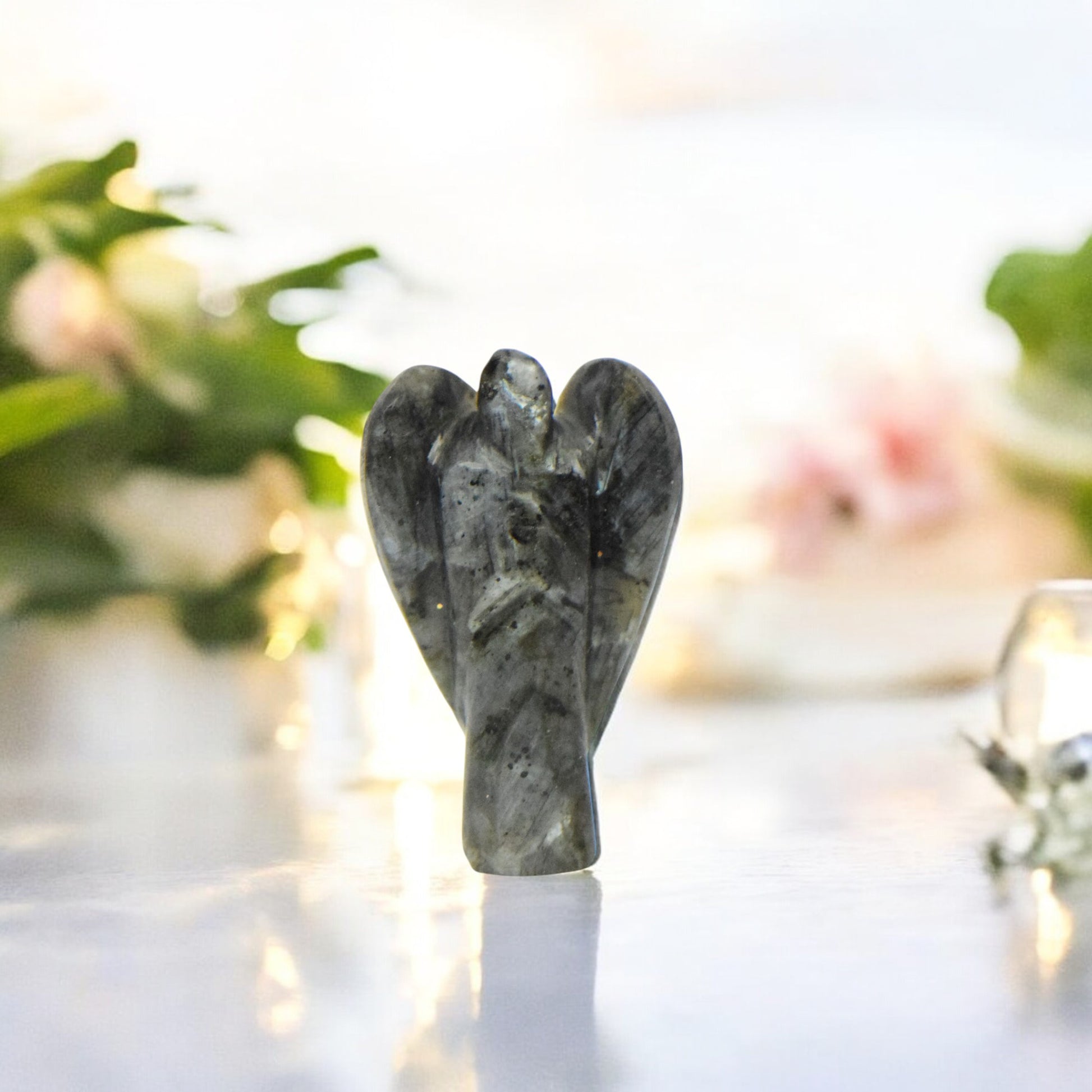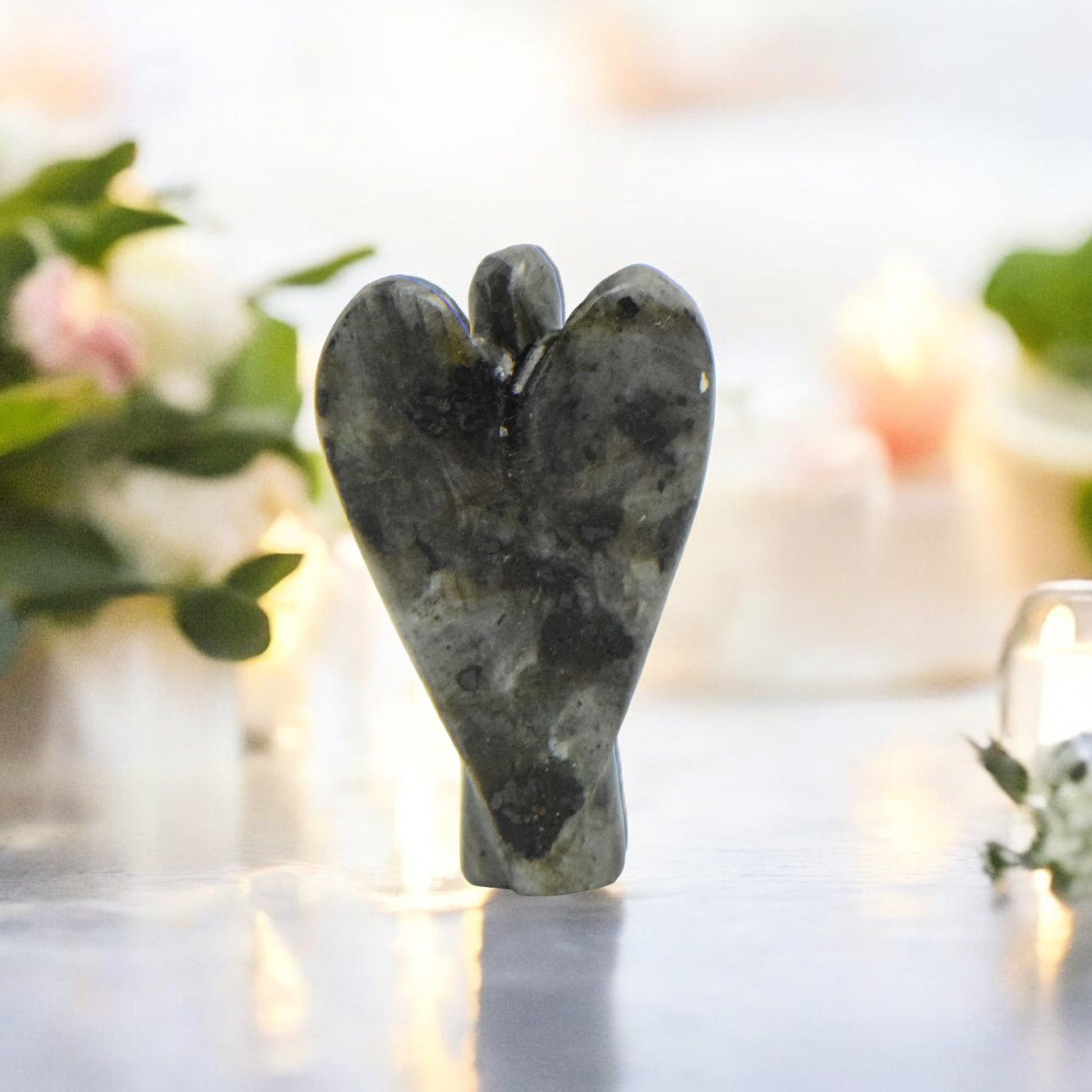 Bring protection, grounding, and clarity into your space with this hand-carved Larvikite Angel. Made from genuine Larvikite, known for its deep gray to black tones with subtle iridescent flashes, this angel figurine symbolizes strength, insight, and spiritual guidance. Its intricate craftsmanship makes it a striking addition to any crystal collection, meditation area, or home décor.