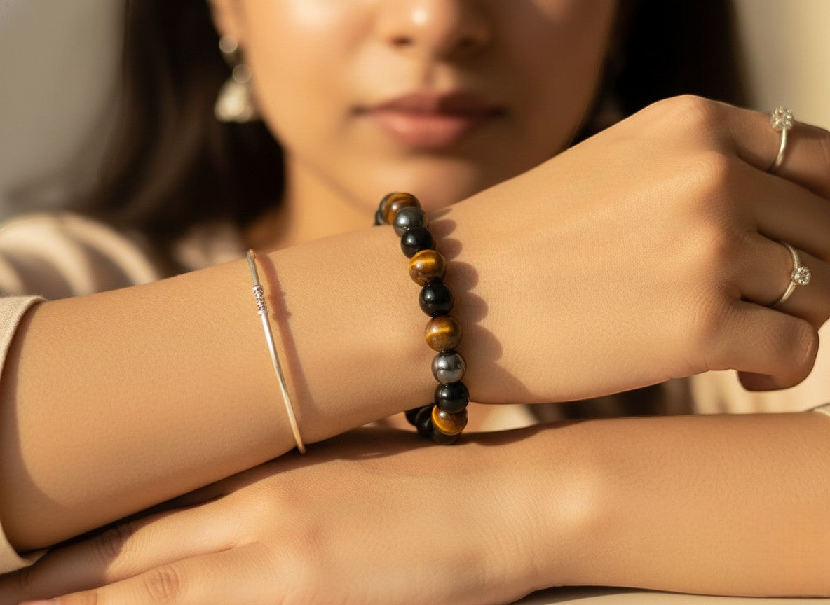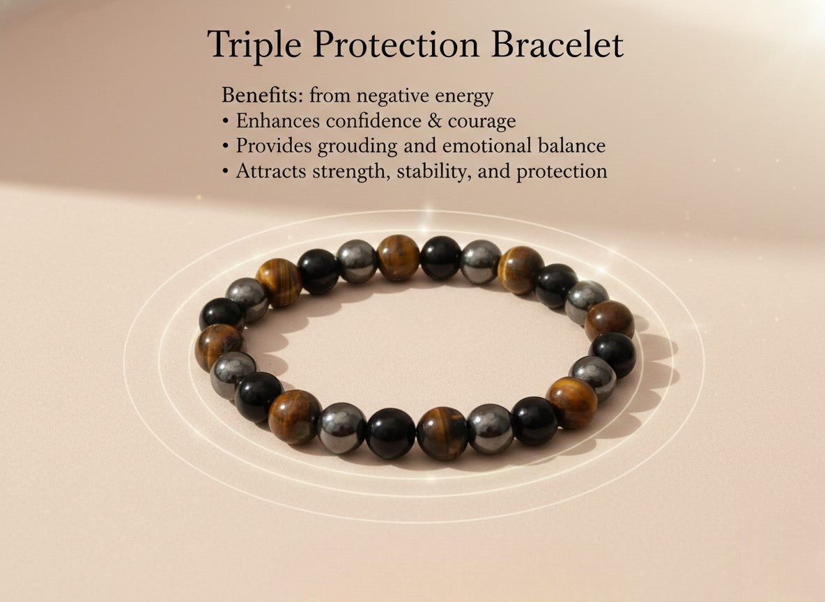 The Triple Protection Bracelet is a meaningful combination of three highly protective crystals — Black Obsidian, Tiger Eye, and Hematite.