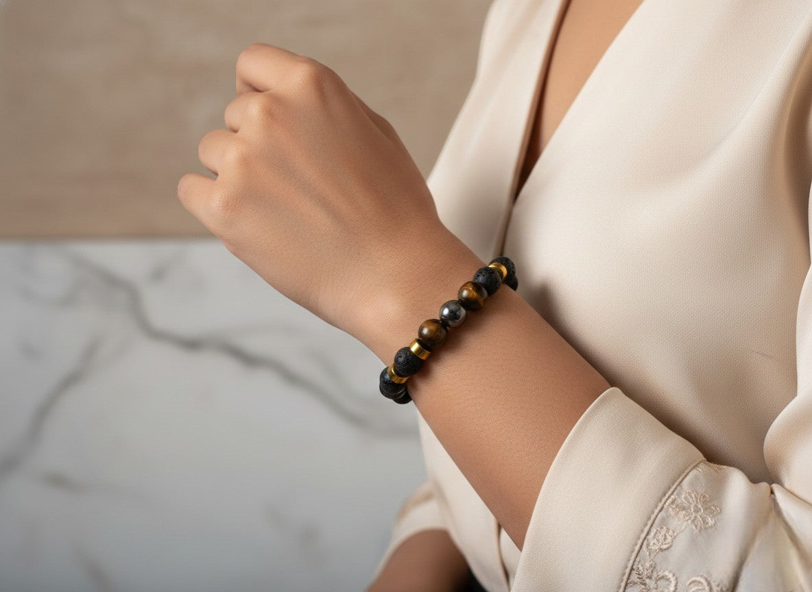The Triple Protection with Lava Bracelet is a strong spiritual combination of Black Obsidian, Tiger Eye, Hematite, and Natural Lava Stone.