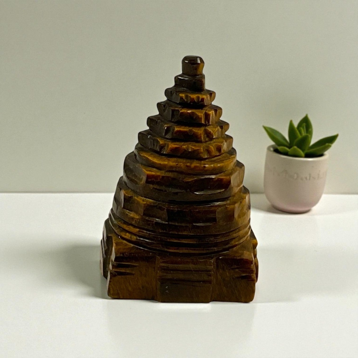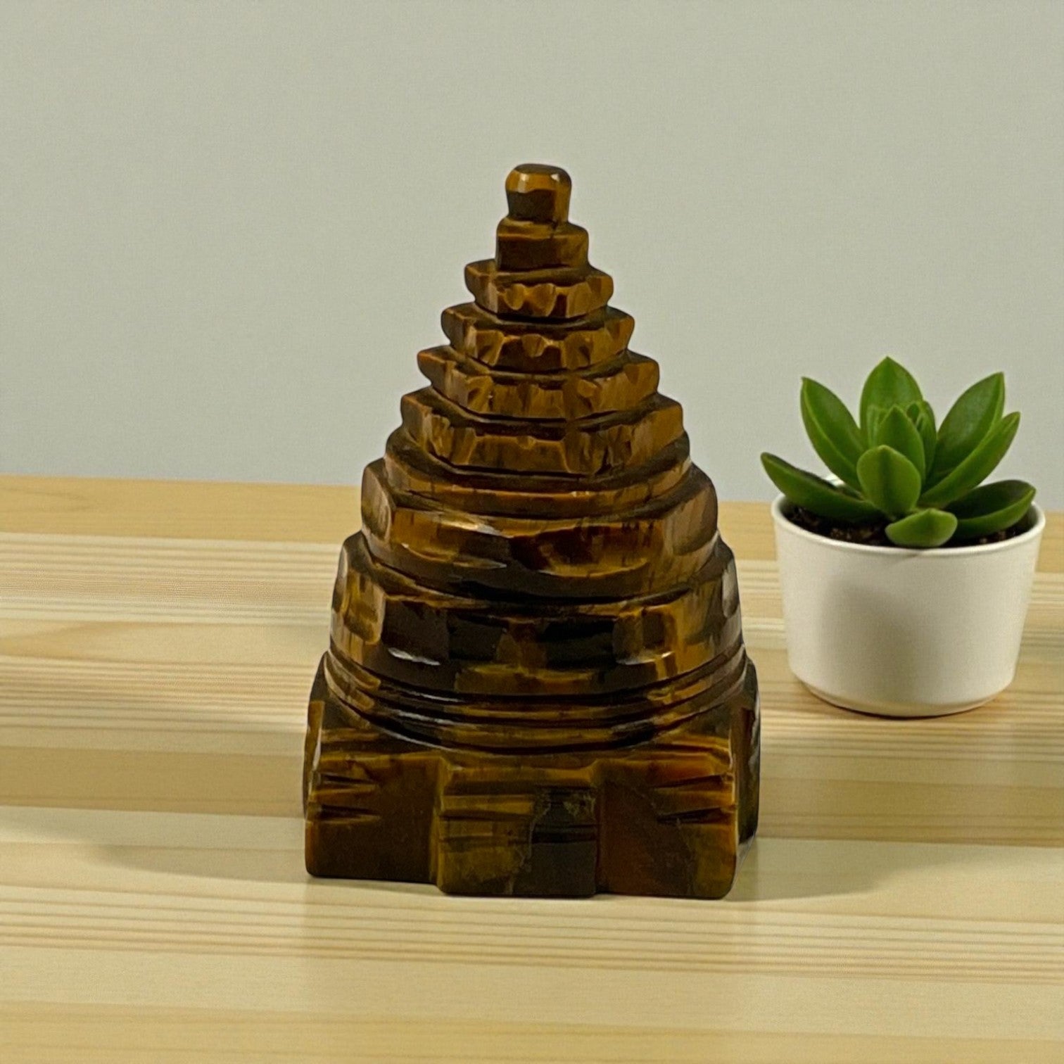 When carved into the sacred Shri Yantra, it becomes a divine symbol of balance, manifestation, and abundance. Its golden-brown shimmer reflects light like a divine flame — symbolizing clarity, courage, and unwavering determination.