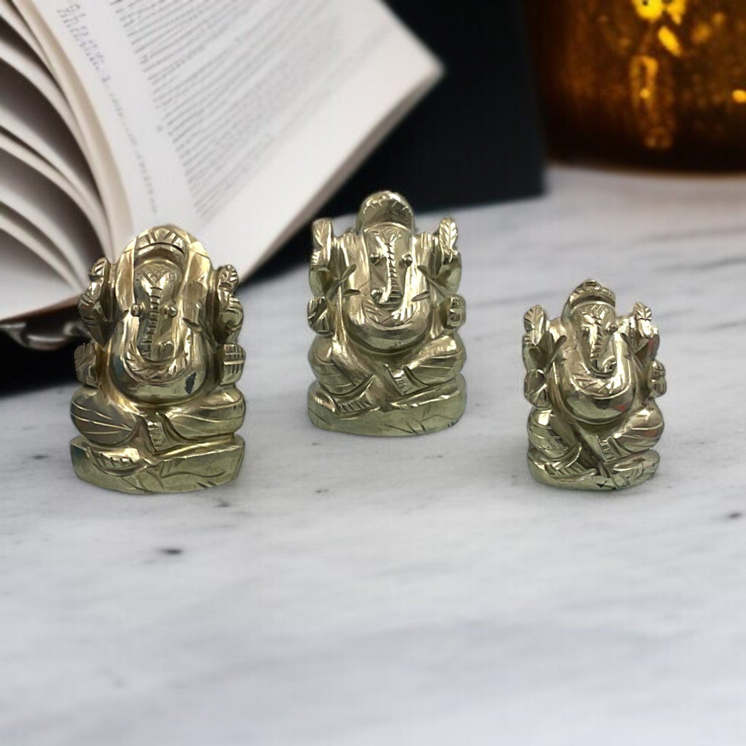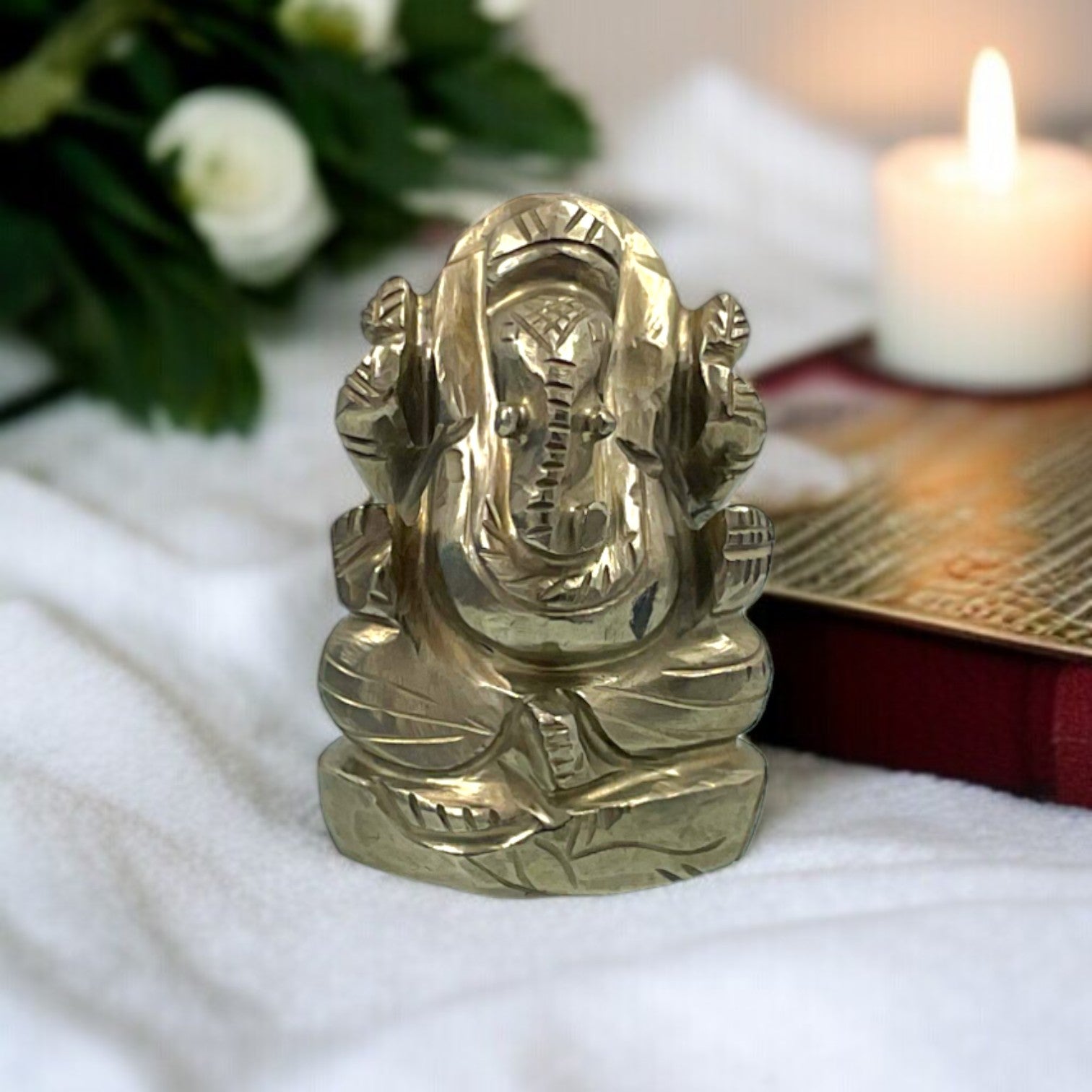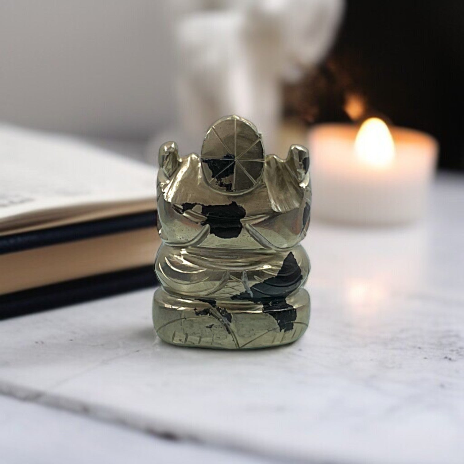 The Pyrite Ganesha combines the divine blessings of Lord Ganesha with the powerful energy of Pyrite, also known as “Fool’s Gold.” Lord Ganesha, the remover of obstacles and the giver of wisdom, prosperity, and success, is highly revered in Hindu tradition. When crafted from Pyrite, this idol not only enhances spiritual growth but also attracts abundance, wealth, and protection.