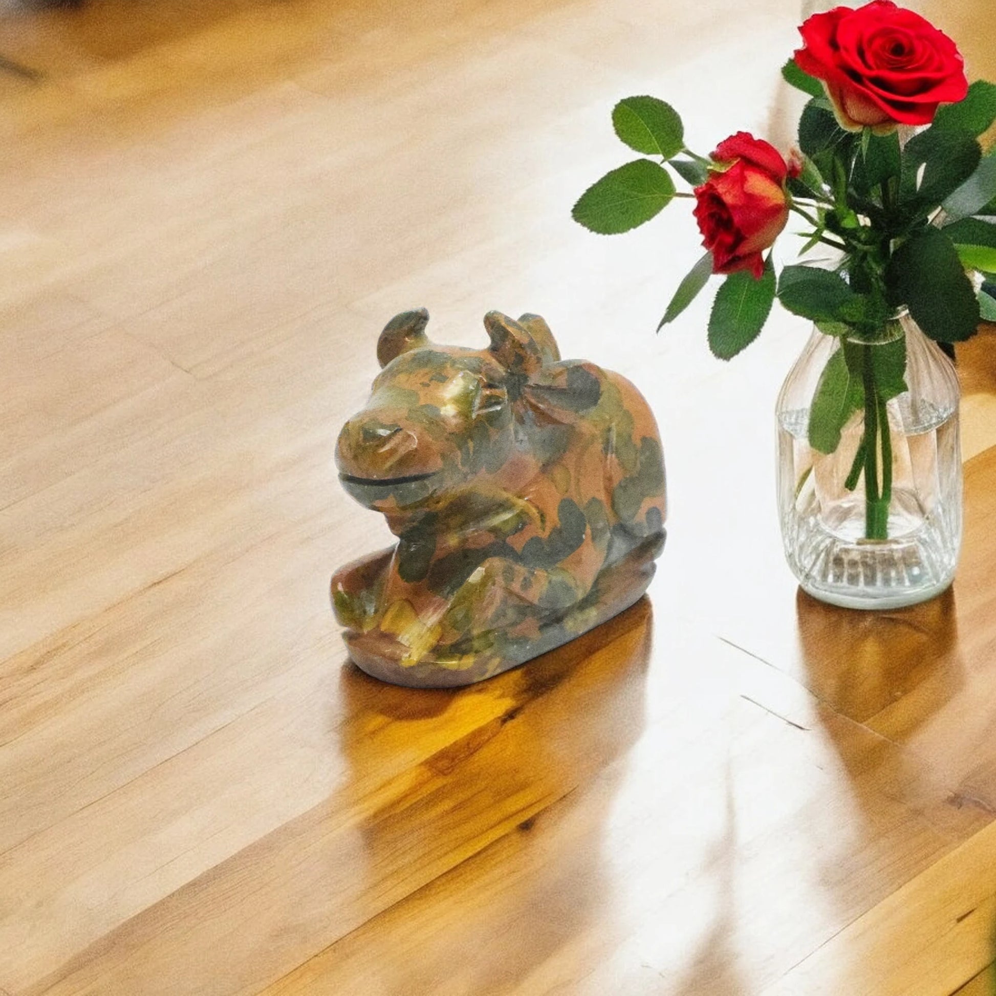 Elevate your spiritual space with the captivating 8" Natural Fruit Jasper Nandi, weighing approximately 165 grams. This exquisitely crafted statue represents Nandi, the sacred bull and devoted gatekeeper of Lord Shiva in Hindu mythology. Made from high-quality Fruit Jasper, known for its unique and vibrant patterns, this Nandi statue embodies devotion, strength, and grounding energy. It is a remarkable addition to any spiritual collection or homedecor.