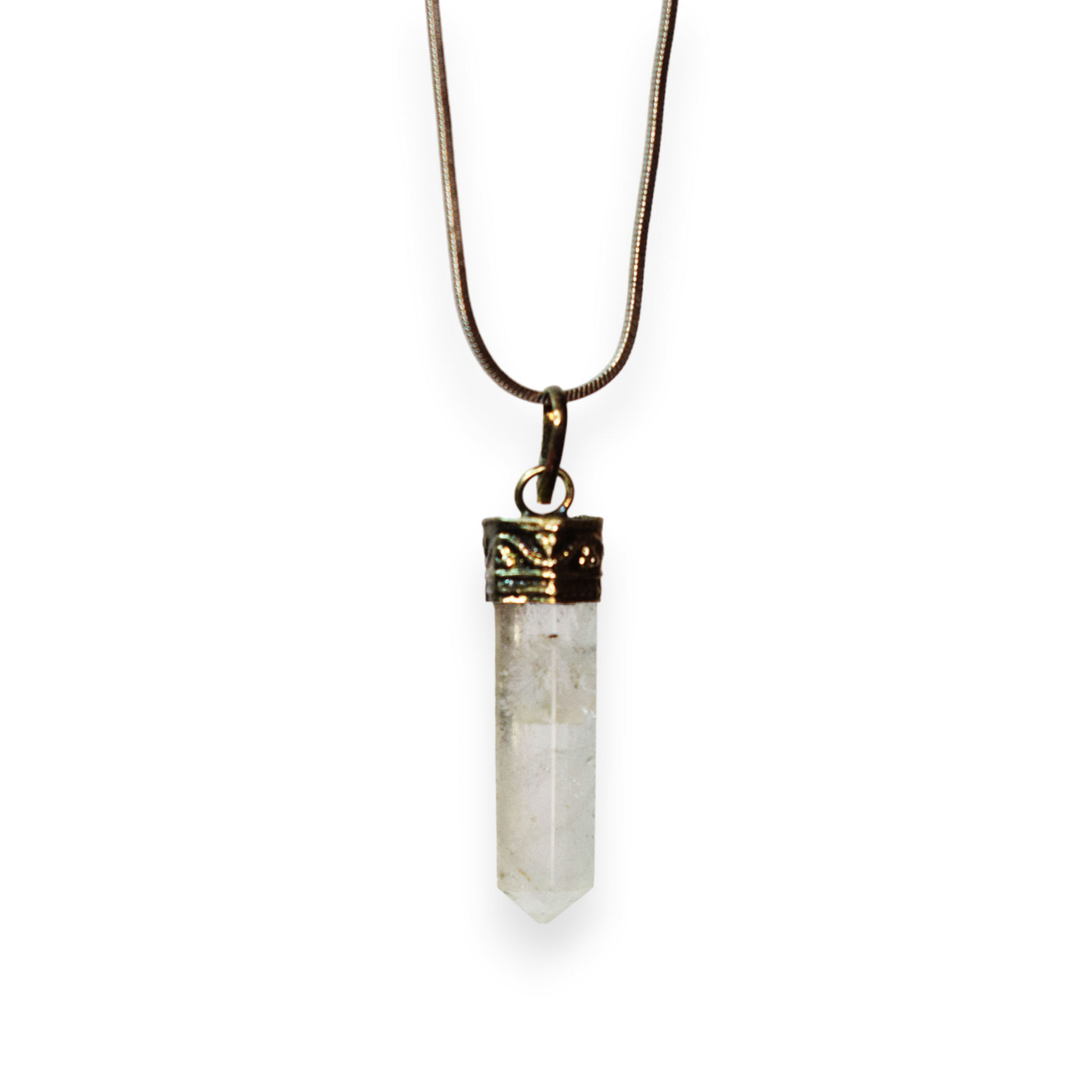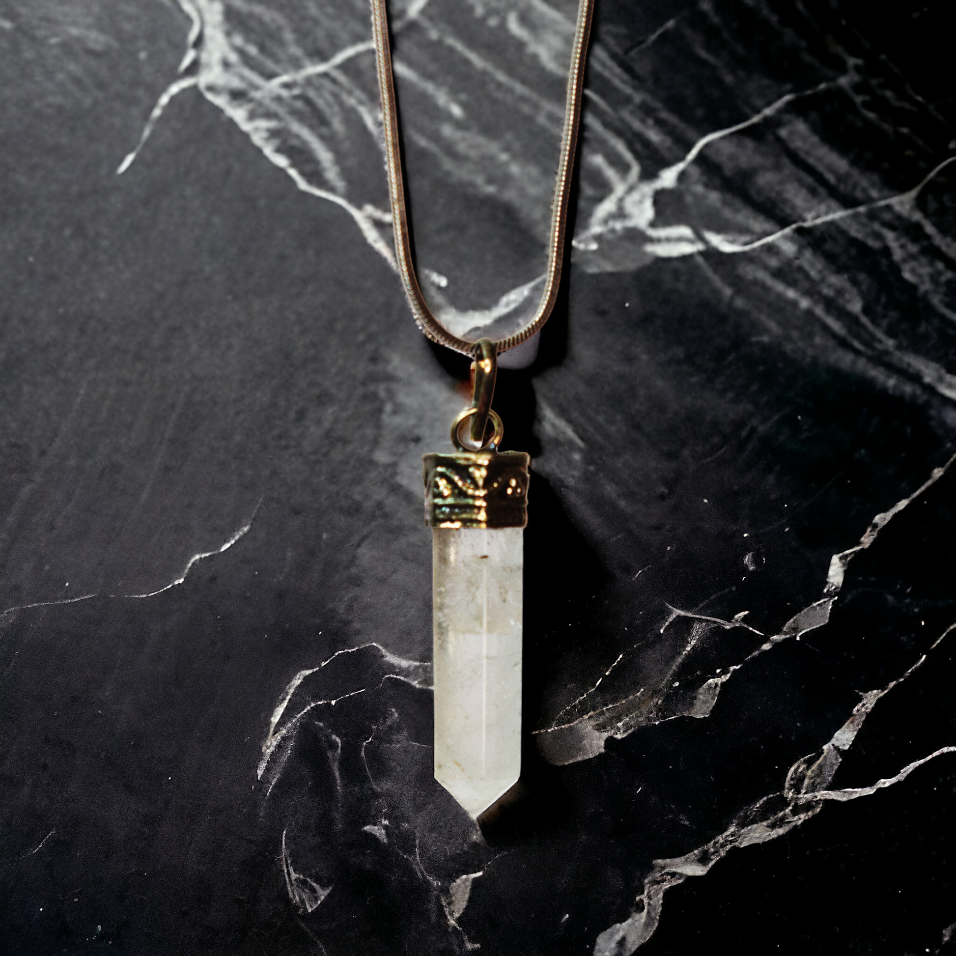 Emanating pure, crystalline light, a clear quartz pendant embodies the essence of clarity, amplifying the wearer's intentions and illuminating the path forward with crystal clarity. With its transparent beauty and radiant energy, clear quartz captivates the beholder with its pristine allure, inviting them to explore the depths of their own inner wisdom.