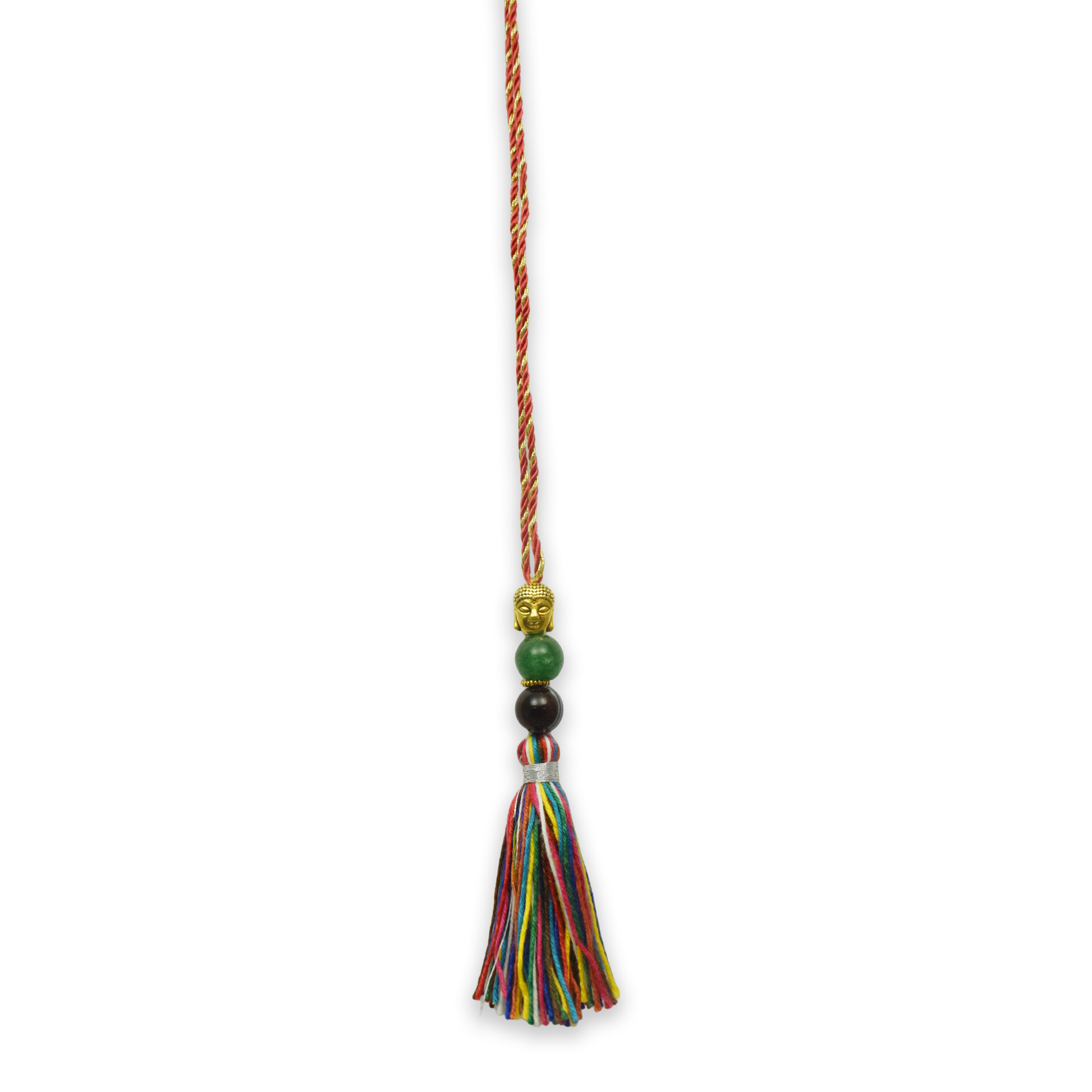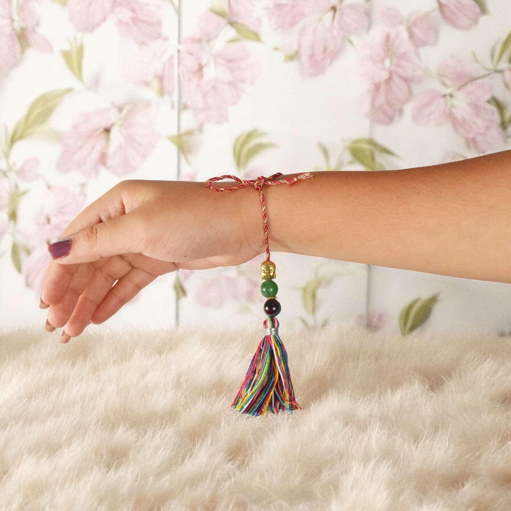 This Raksha Bandhan, express your love and best wishes with the Crystals Lumba Rakhi featuring a beautiful combination of Green Aventurine and Sulemani Hakik. This elegant Rakhi blends the soothing and protective properties of these powerful crystals, making it a thoughtful and meaningful gift for your Bhabhi.