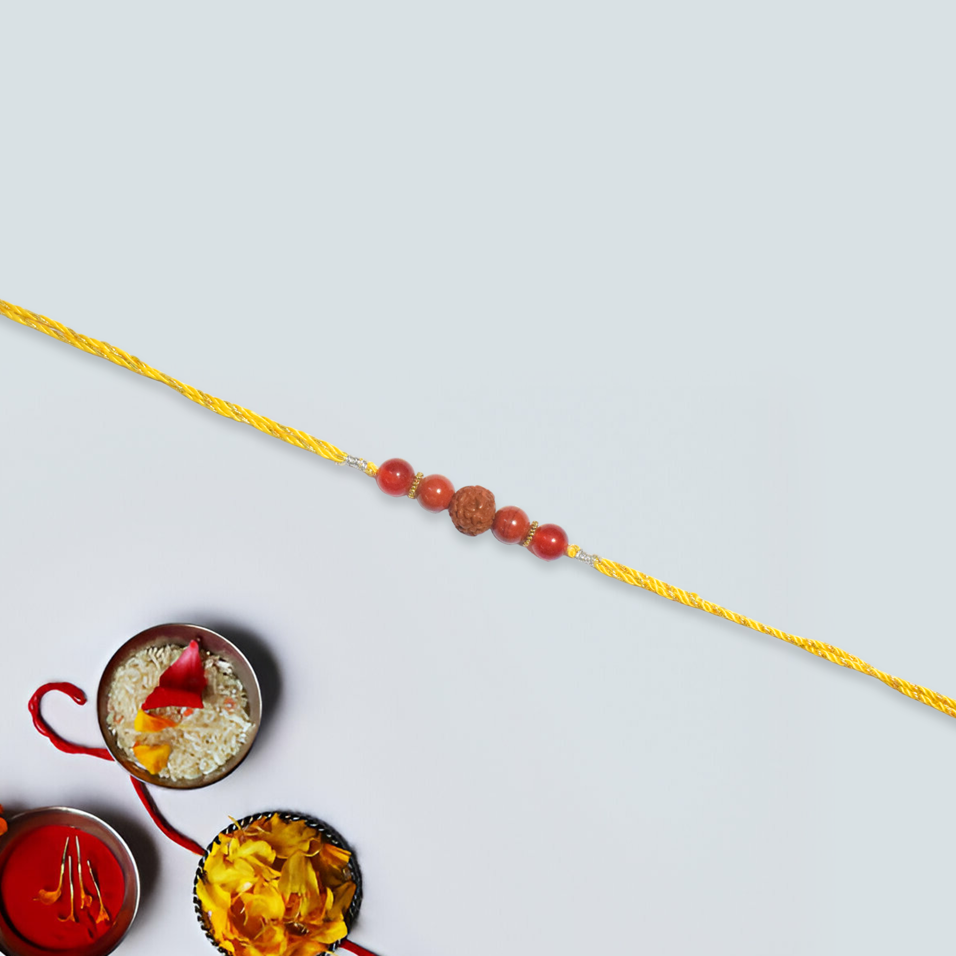 "Infuse the spirit of ancient wisdom and vibrant energy into your Rakhi celebrations with our Crystals Rakhi featuring Rudraksha, Jasper, and Carnelian. Each crystal in this unique combination offers its own distinctive qualities: