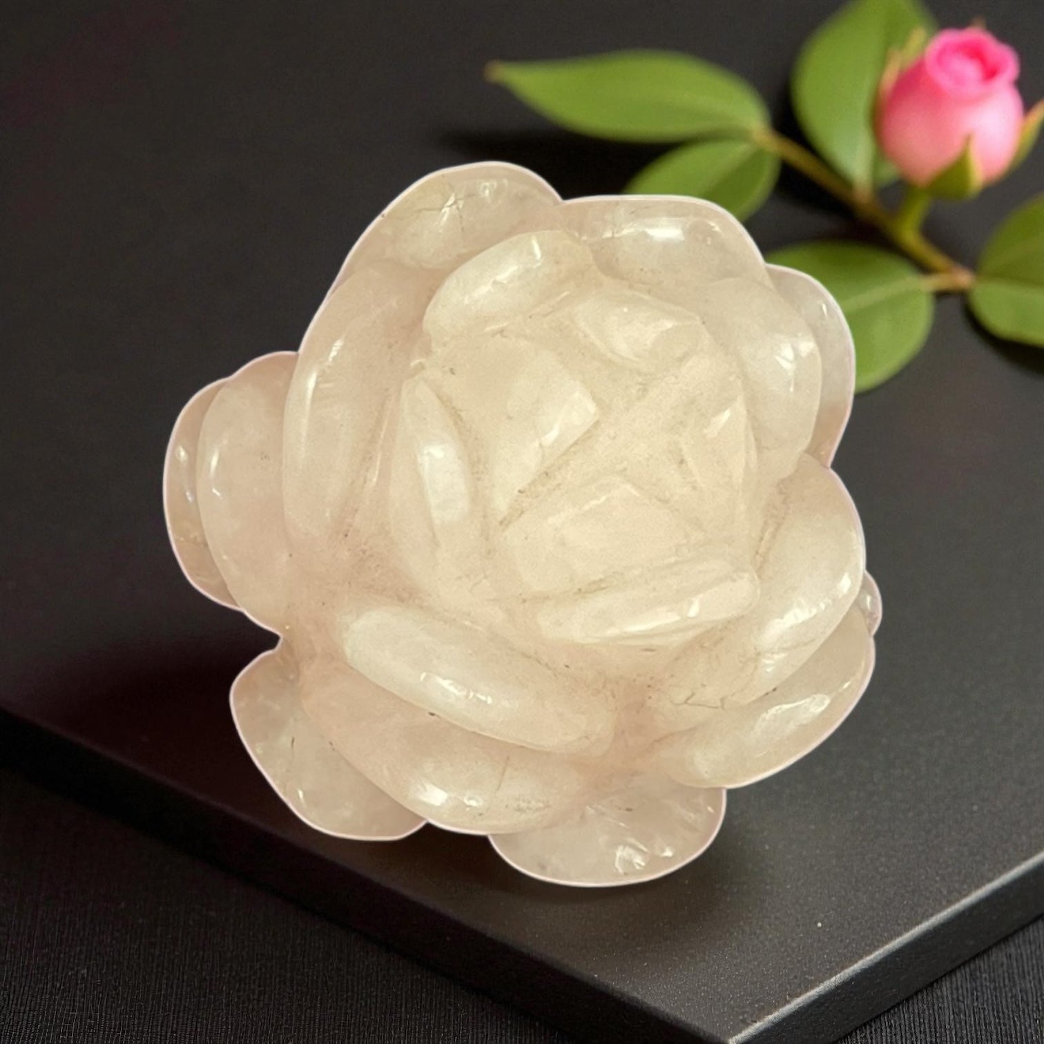 Elevate your space with the soothing beauty of this hand-carved Rose Quartz Flower. Crafted from 100% natural Rose Quartz—the stone of unconditional love—this floral carving radiates calming pink energy and adds an elegant touch to any décor or spiritual setup.
