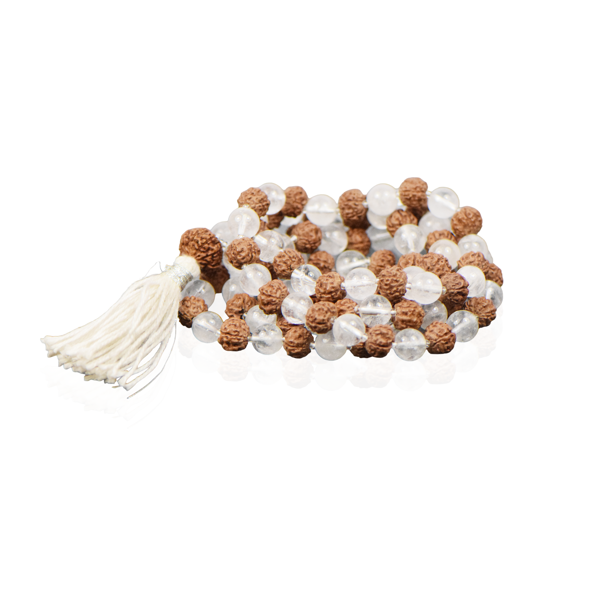 Beads: 108+1 beads (108 Sphatik and Rudraksha beads + 1 10 Mukhi Rudraksha bead), each 8mm in diameter