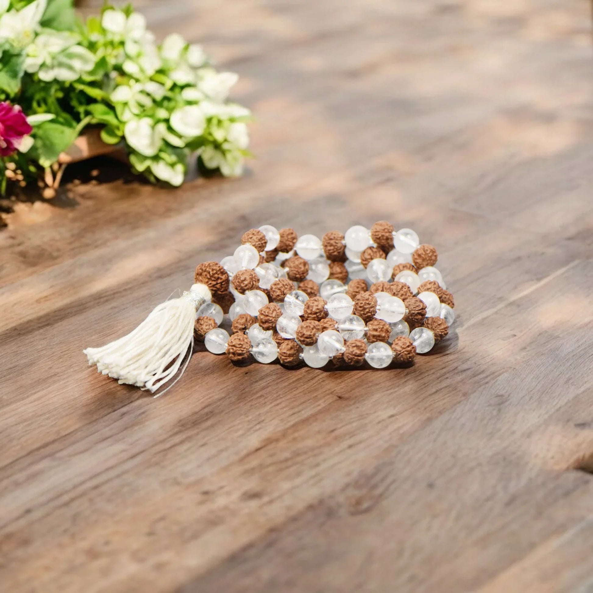 5 Mukhi Nepali Rudraksha beads with the clarity and purity of Sphatik (clear quartz) beads. Each bead measures 8mm, and the mala consists of 108 beads plus one 10 Mukhi Rudraksha bead, enhancing its spiritual significance. This mala is ideal for meditation, japa (chanting), and wearing for balance, clarity, and protection.