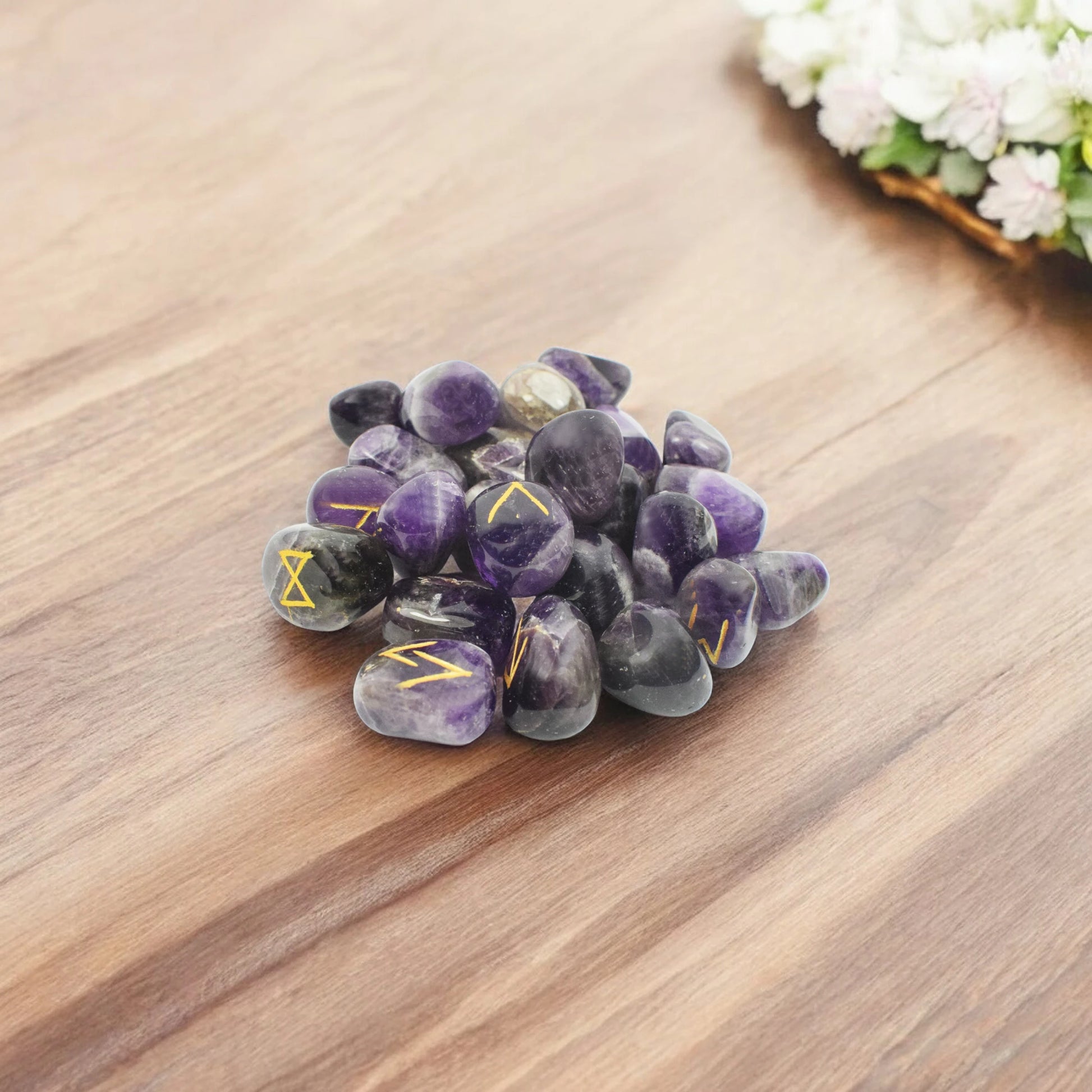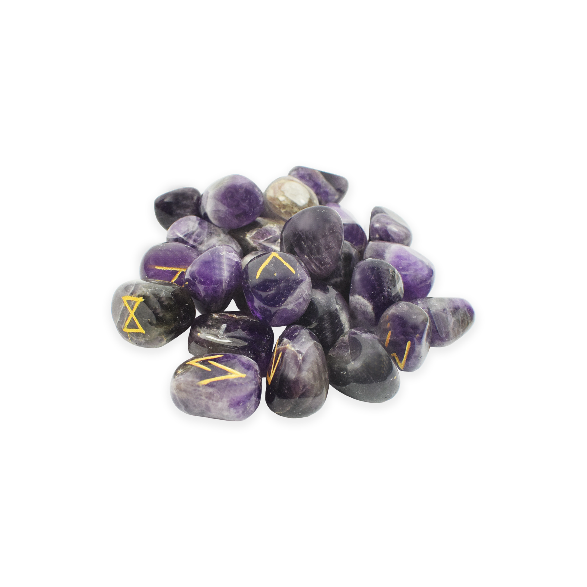 The Amethyst Tumble Stones / Rune Set is a stunning collection of hand-polished amethyst stones, each engraved with ancient runes. Known as the "Stone of Spirituality and Sobriety," amethyst is revered for its calming and protective properties. This set is perfect for those who practice divination, meditation, or energy work, offering a combination of spiritual insight and aesthetic beauty.