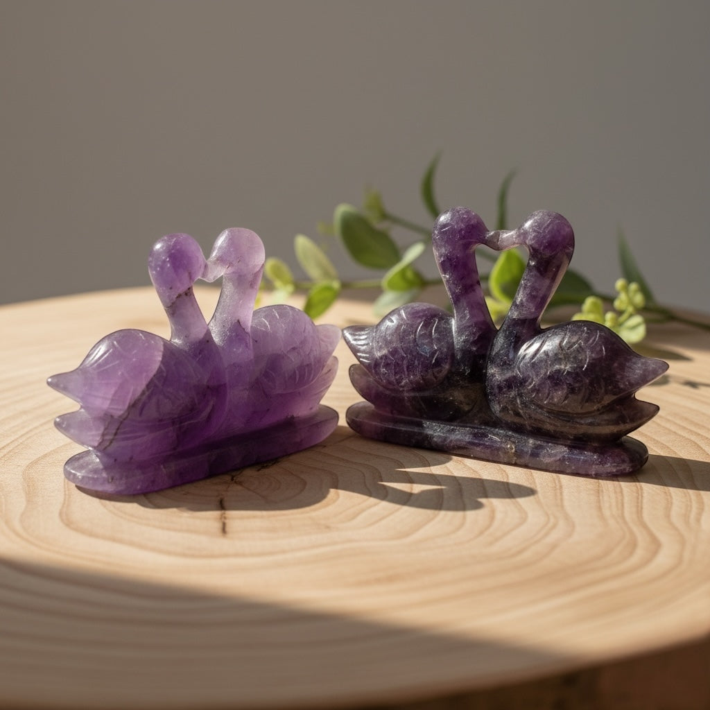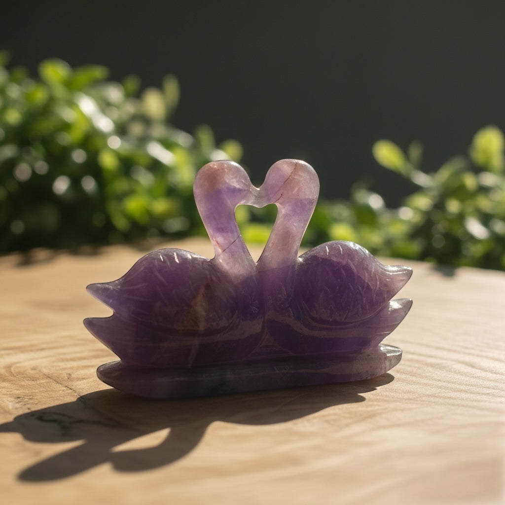 Bring home the soothing energy of peace and balance with this beautifully hand-carved Amethyst Duck. Known as the Stone of Calmness and Spiritual Growth, Amethyst promotes relaxation, intuition, and emotional clarity. The duck symbolizes loyalty, affection, and togetherness — making this crystal carving a perfect gift for loved ones or a serene addition to your home décor.